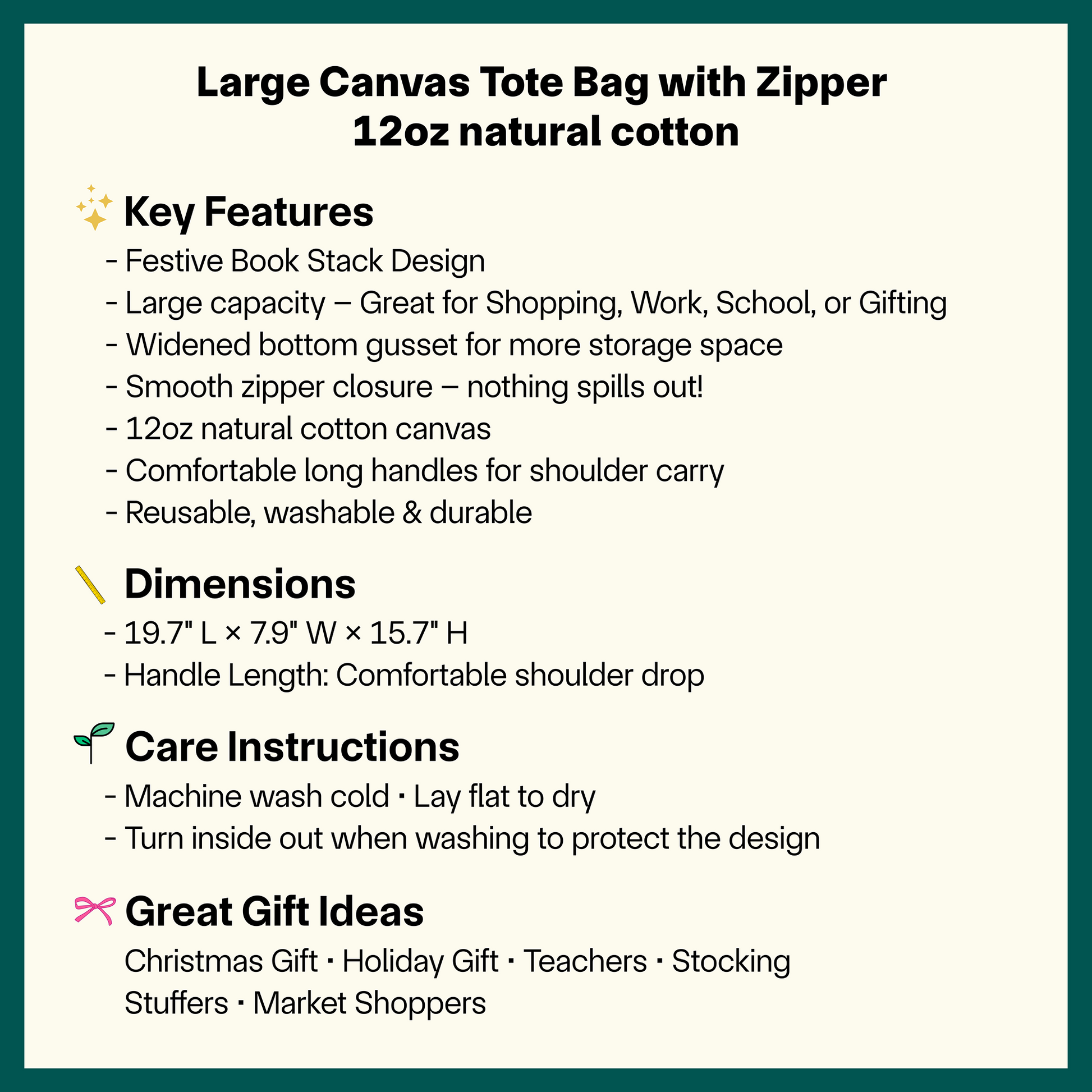๐ŸŒŸ All Booked for Christmas โ€“ Large 12oz Canvas Tote Bag with Zipper