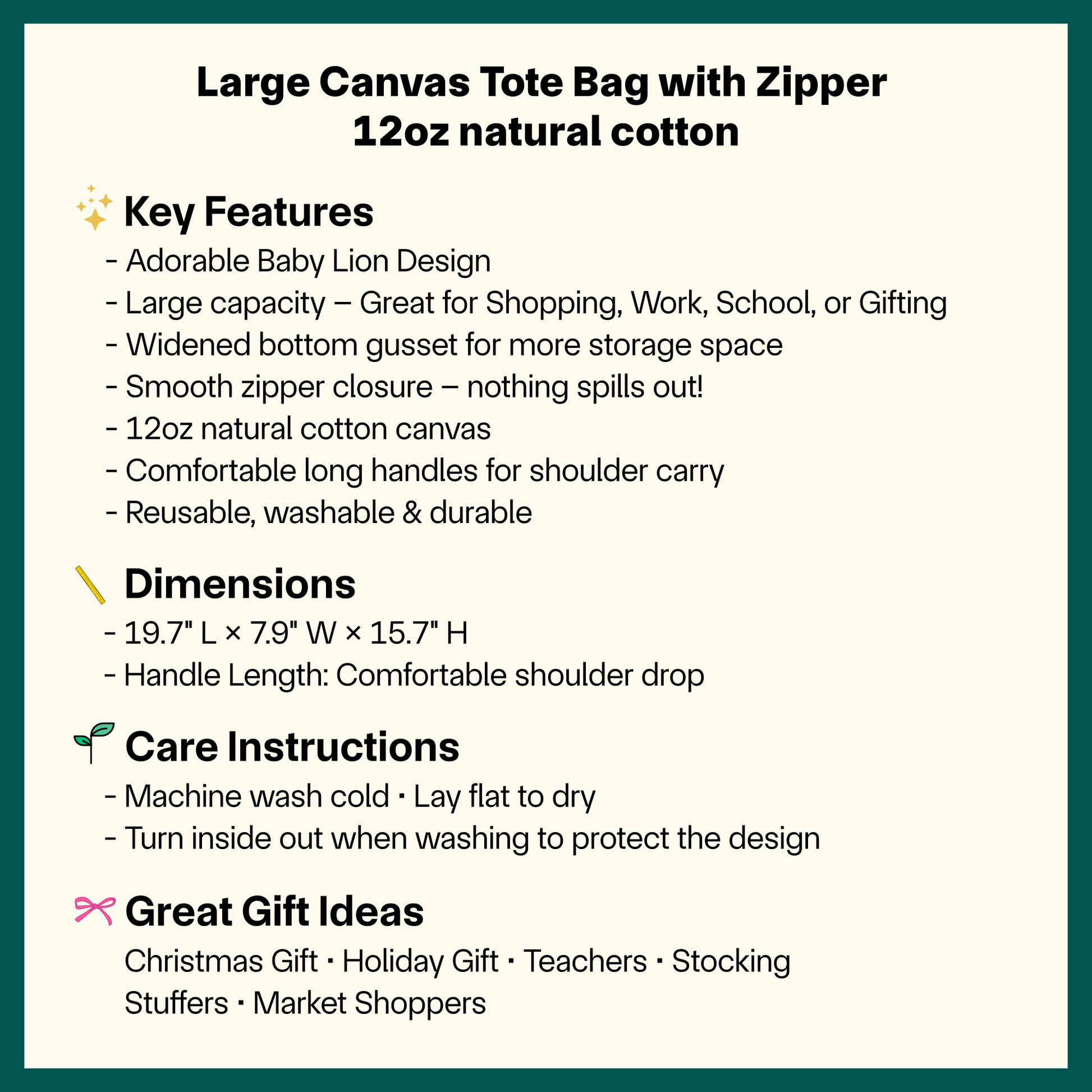 Cute Baby Lion Canvas Tote – Large 12oz Zippered Cotton Bag, Eco-Friendly & Washable.