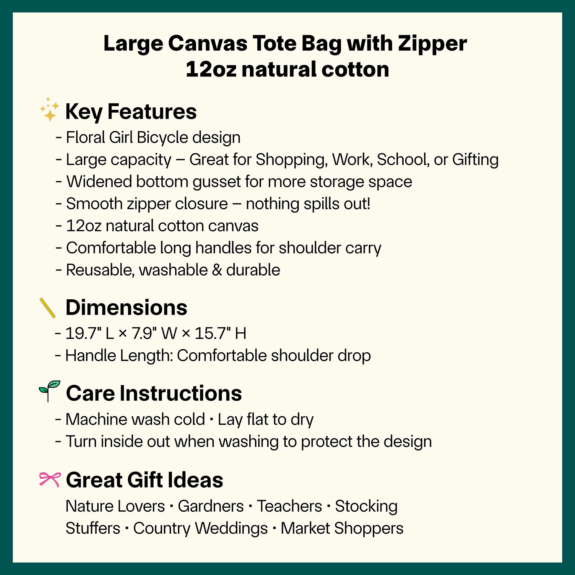 π² Floral Girl Bicycle Canvas Tote, Large Reusable Zipper Tote