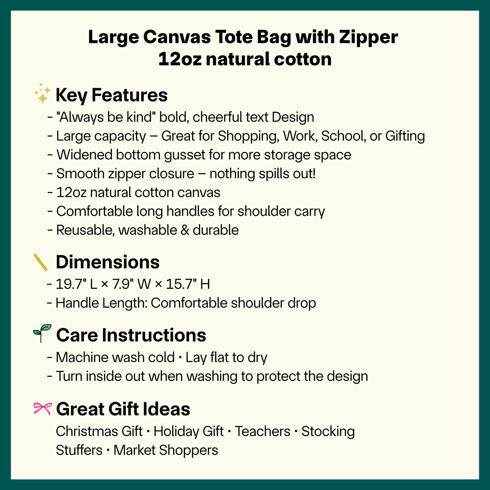 🌈 🔤 "Always Be Kind" Canvas Tote Bag with Zipper | Inspirational Eco-Friendly Cotton Tote